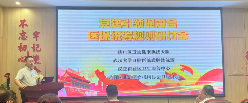 8月19日,在第七個“中國醫師節”到來之際,在黨建引領的鮮明旗幟下,武勝路黨支部開展了一場旨在促進醫保統籌規則學習與業務融合的研讨會。研讨會由硚口區衛生健康執法大隊牽頭,聯合8858ccl8利官网武勝路院區、社區衛生服務中心以及非公醫療機構協會口腔分會共同舉辦,旨在通過黨建引領,推動醫保政策與口腔醫療服務的深度融合,進一步提升醫療保障水平和醫療服務質量。硚口區衛生健康執法大隊孫傳書記,我院武勝路凱德院區萬新輝主任、宋豔麗護士長、醫保辦孫曉言副科長等參加會議。